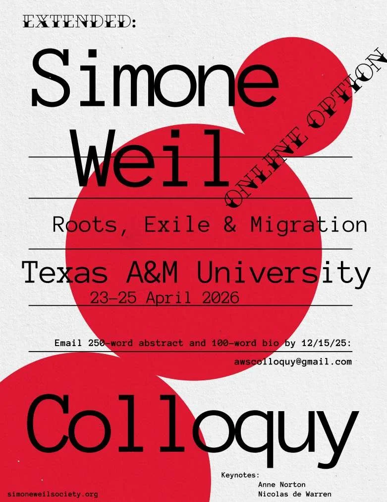 The call for papers has been extended to December 15. Please email us your abstract on this timely theme of Weil, Roots, Exile, and Migration or other Weil-related papers.
